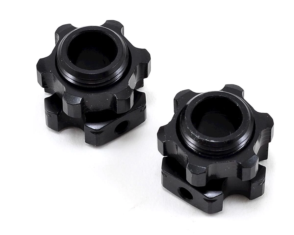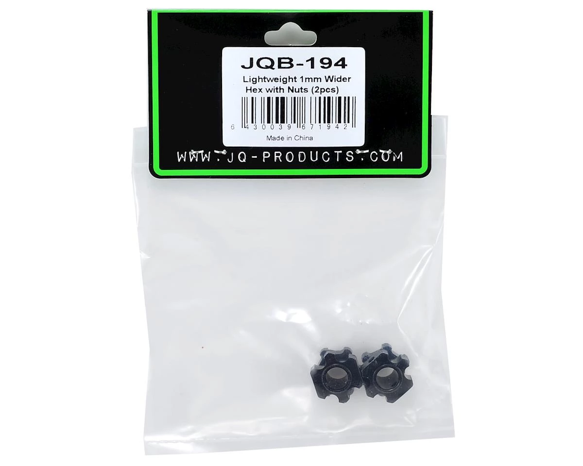 This is a pack of two optional JQ Products Lightened 1mm Offset Hexes and Wheel Nuts, and are intended for use with JQ Products line of THE Car 1/8 scale buggies. These lightened hexes help reduce the overall rotational mass on the drivetrain while also giving THE Car a wider stance from the offset.