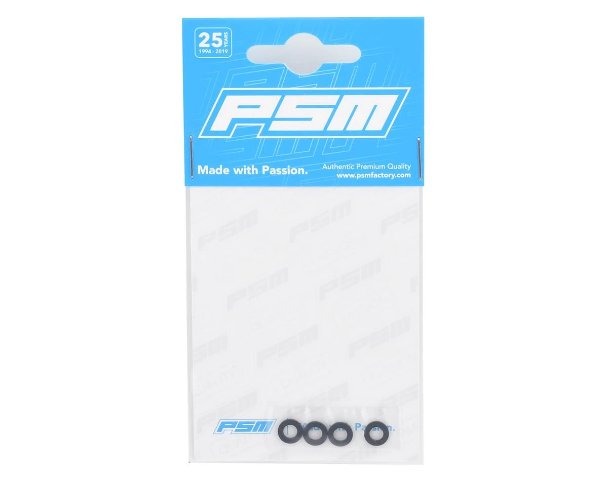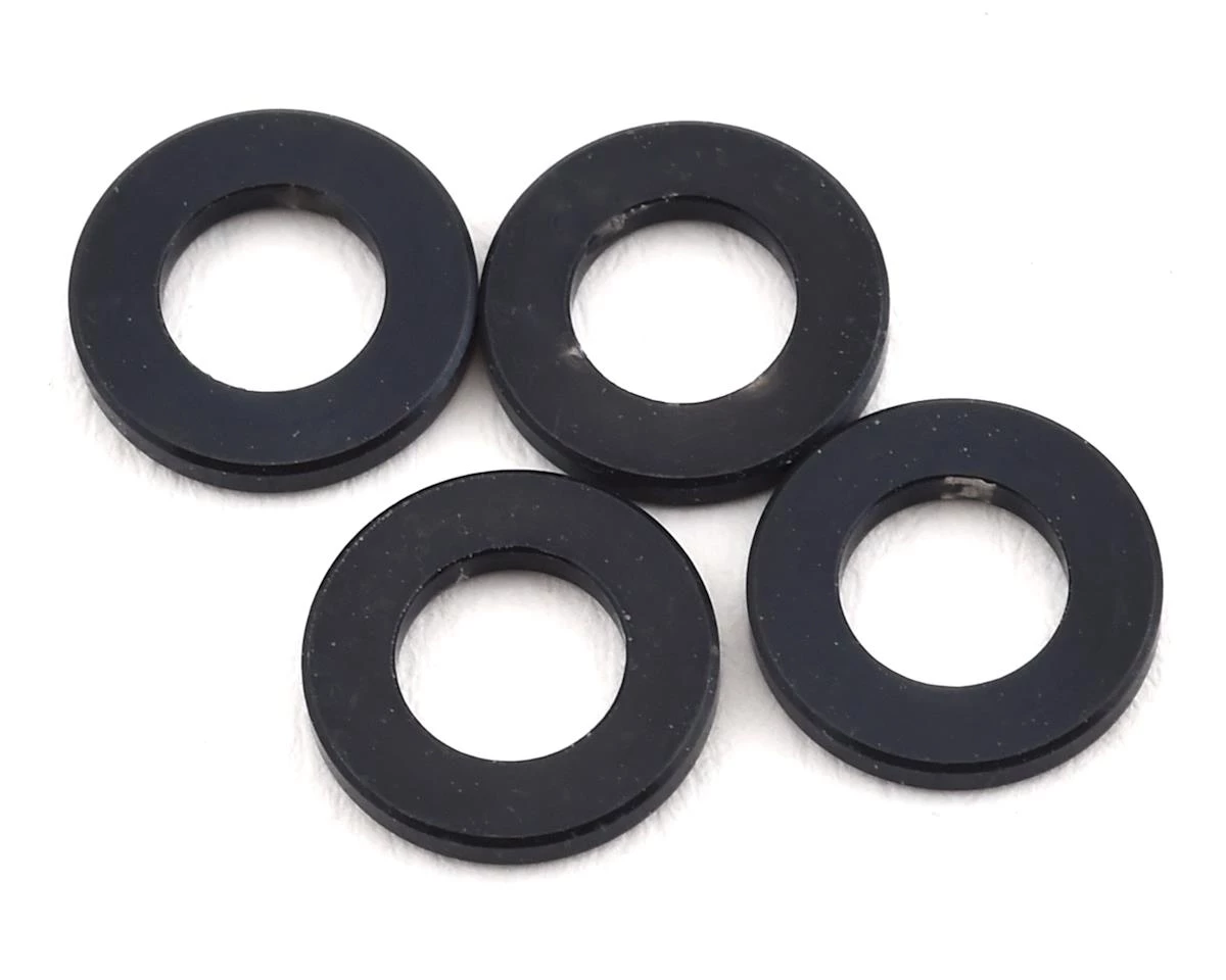 This is a set of four PSM Dark Grey Aluminum Lower Arm Spacers, designed for use with the Team Associated RC8B3.1. These optional lightweight aluminium spacers are designed for precise lower arm adjustment, offering minimized axial play along with great wear resistance.