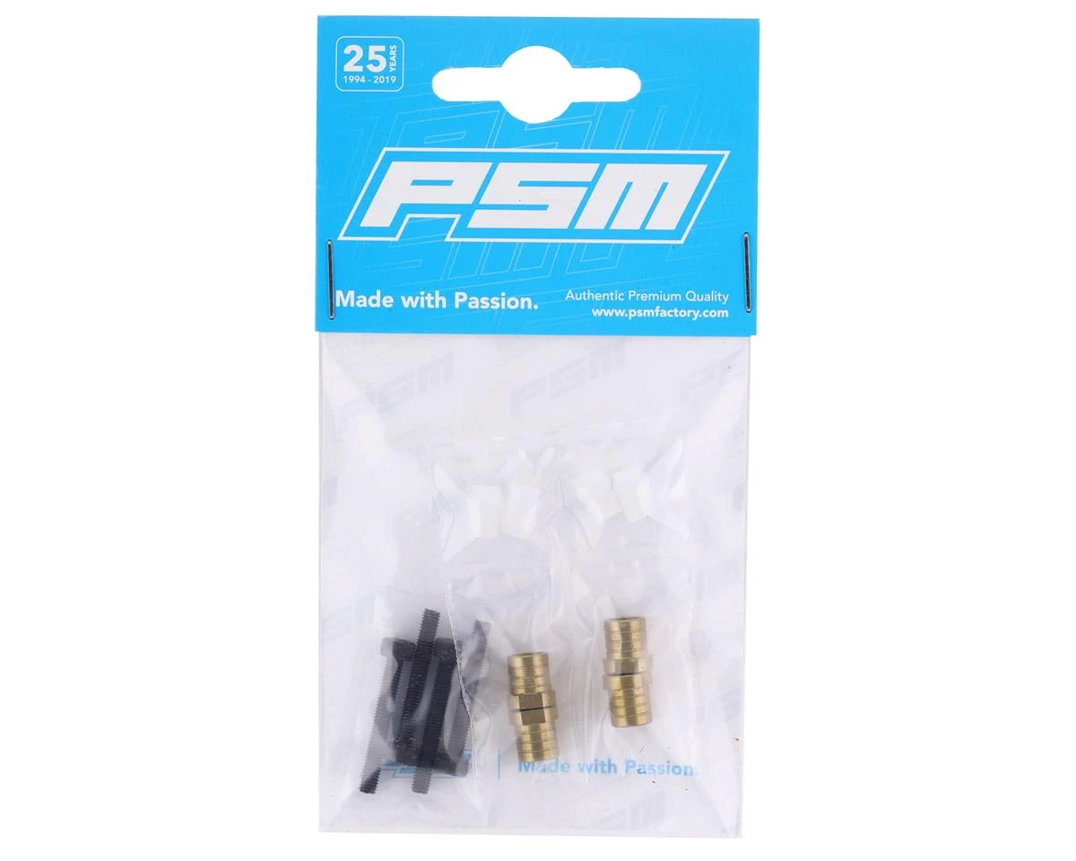 PSMÂ B74 Aluminum Shock Standoffs with Bushings. These optional standoffs are designed to add better consistency to the shock movement on the Team Associated RC10 B74. This version of the PSM B74 standoffs feature a +1mm offset when compared to the standard. Package includes four standoffs, four bushings and hardware.Â