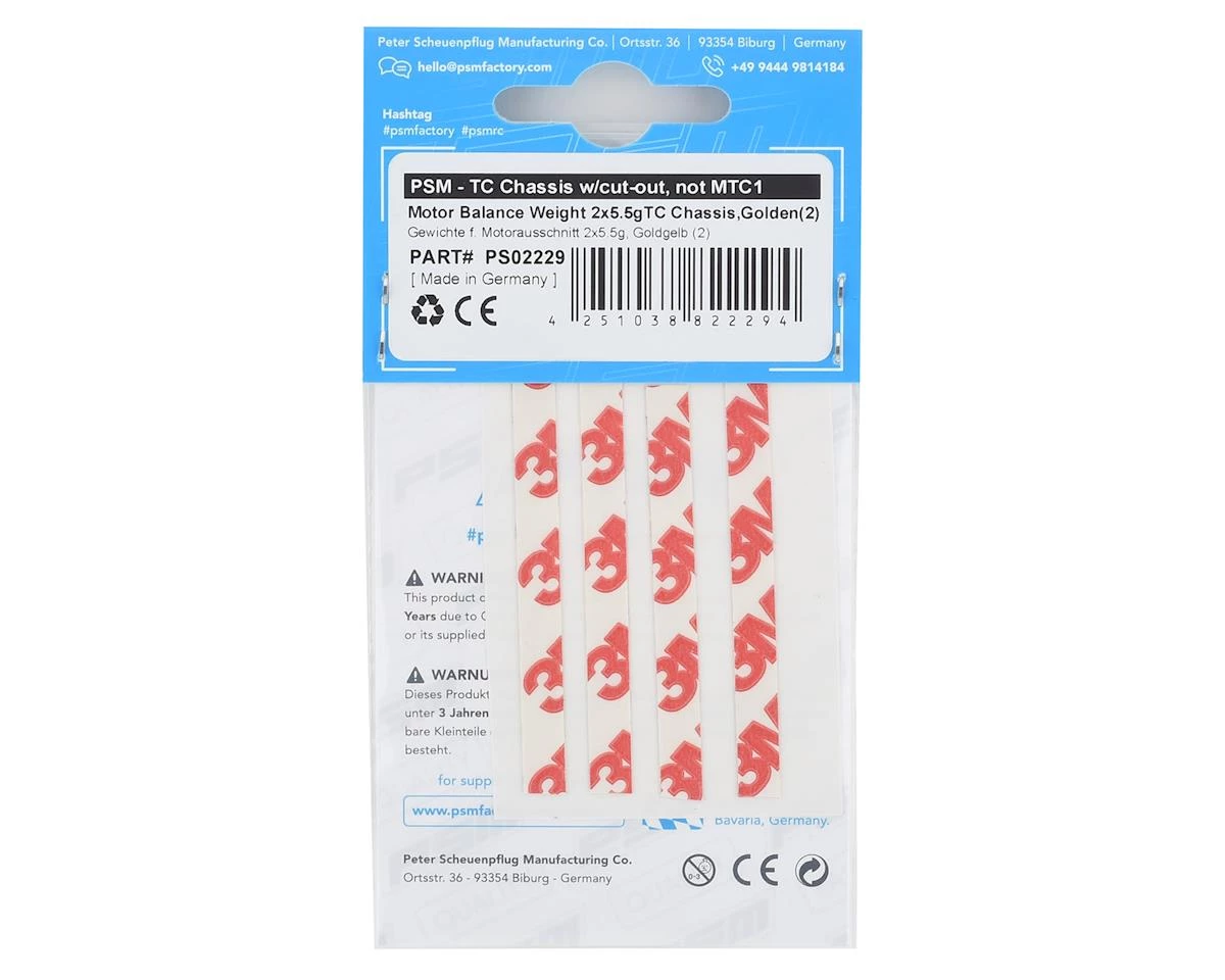 This is a PSM Golden Motor Balance Weights are compatible with XRAY T4’19, Yokomo BD9’19, Tamiya TA07 models equipped with the PSM HTC & DTC Chassis (2019). These optional weights can be added to the opposite motor position cut-out to greatly improve the balance of your chassis. Thanks to these weights you can fine balance your chassis pretty easily and the inlays will not modifying any torsional characteristics of the chassis or adding up to its original thickness. To achieve these advantages, the weight is attached using strong double sided tape (included).