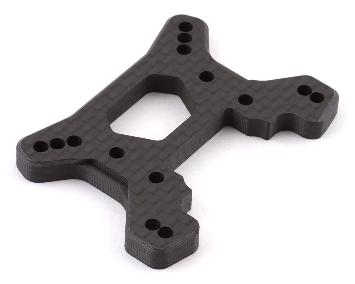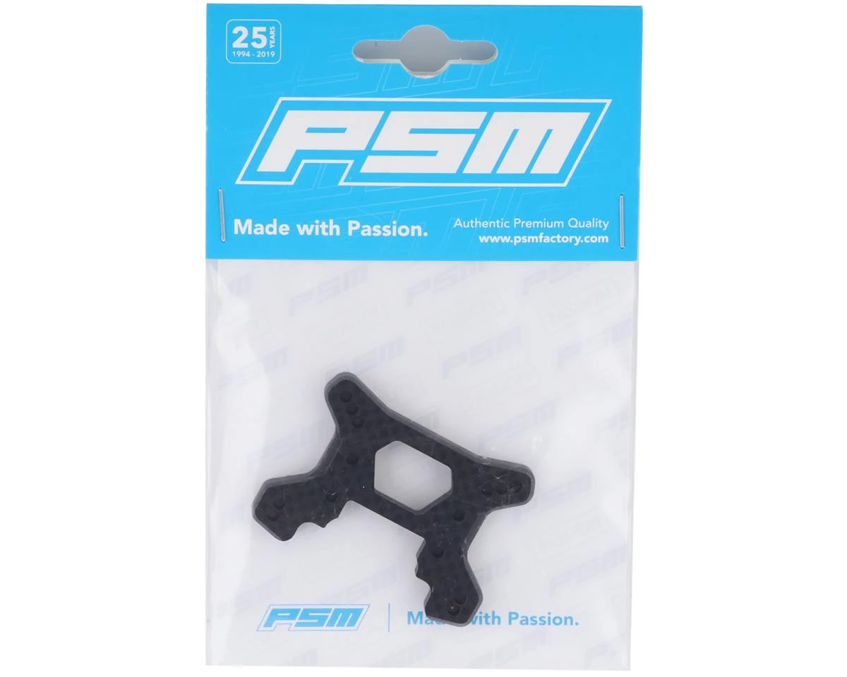 The PSM RC10 B74 4mm Carbon Front Shock Tower V2Â offers an alternative setup option for your Team Associated B74 vehicle. The upper shock holes have been moved -0.7mm lower, and the upper link holes have been moved +1.5mm further out compared to the stock shock tower. compared to the stock shock tower.