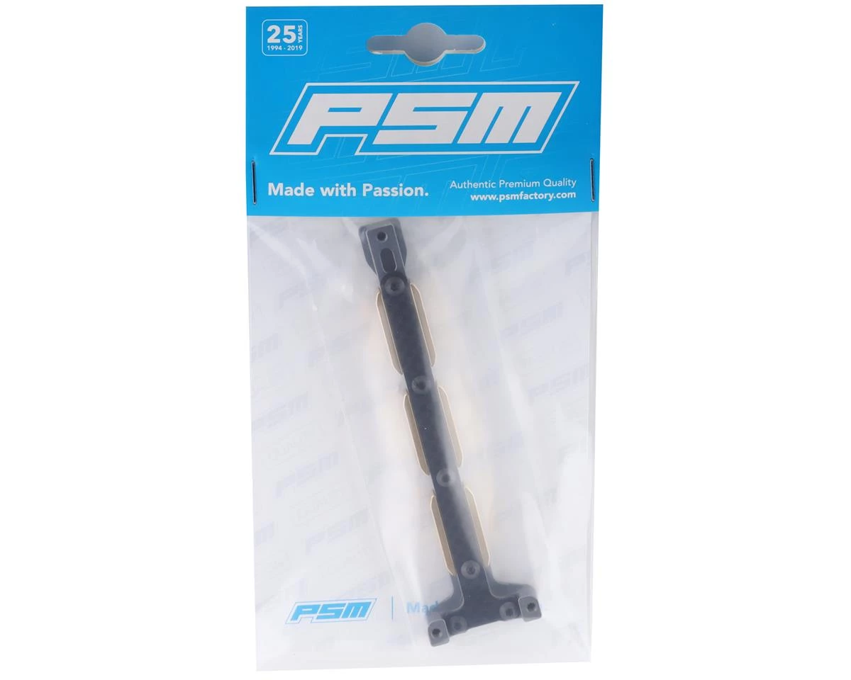 This is a PSM RC10B74 Grey Aluminum Rear Chassis Brace Set, intended for use with the Team Associated RC10 B74.1D Team 1/10 4WD Off-Road Electric Buggy Kit. Featuring one 9g balancing weight and an aluminum body, this chassis brace was developed to improve the performance of the B74 vehicle.
