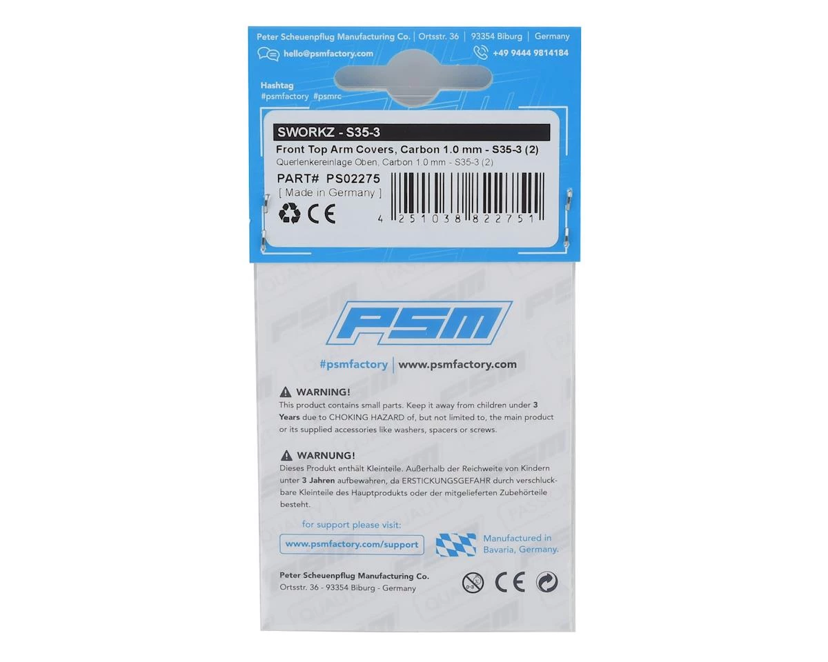 This is an optional set of two PSM S35-3 1.0mm Carbon Front Top Arm Covers, intended for use with the SWorkz S35-3 1/8 Pro Nitro Buggy Kit and cut from quality carbon plate.