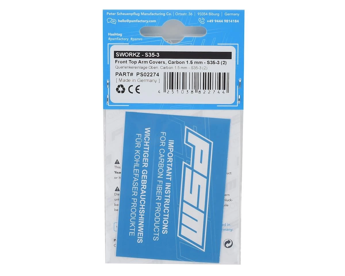 This is an optional set of two PSM S35-3 1.5mm Carbon Front Top Arm Covers, intended for use with the SWorkz S35-3 1/8 Pro Nitro Buggy Kit and cut from quality carbon plate.